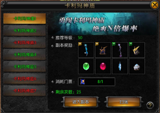 卡利玛神庙作为单人副本,每日可进入3次,会员玩家可获得额外进入次数,副本限时20分钟。